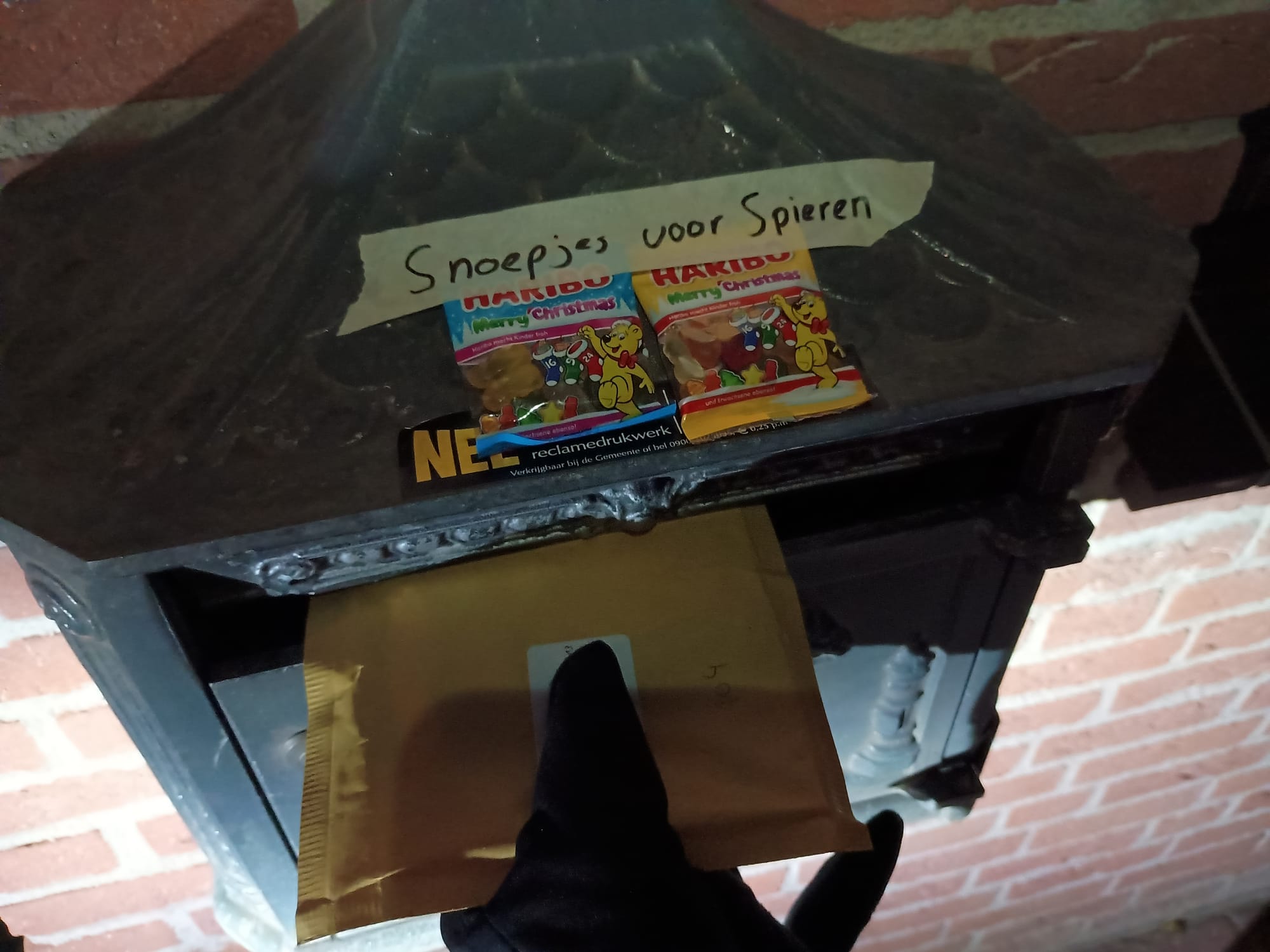 Omdat een actie voor Spieren voor Spieren vraagt om beweging én spierkacht, stapten wij in de vroege ochtend van 5 december om 05:10 op de fiets om de bestellingen te gaan bezorgen. We hadden een lange tocht voor de boeg en fietsten de duisternis in. Met beiden aan de ene kant een tas vol pakketjes en aan de andere kant een tas vol eten en extra warme kleding.